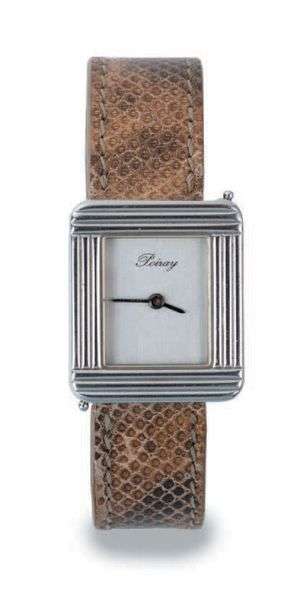 Montre de dame en acier, cadran carré de couleur gris anthracite uni. Mouvement à quartz. Cadran et boitier signés.