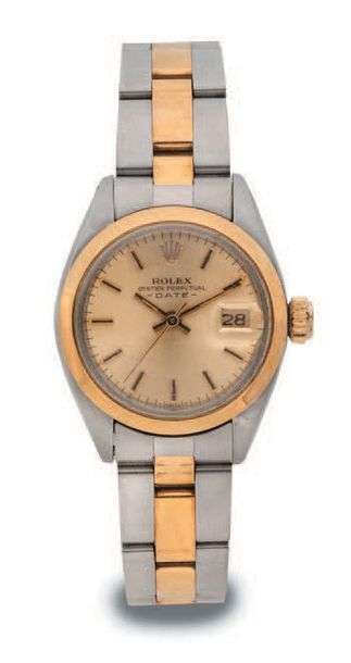 Guichet date à 3h. Bracelet Oyster or/acier, boucle déployante. Un maillon supplémentaire joint. Verre plexi cyclope. Diam 26 mm. Bon état, fonctionne. Prévoir révision.