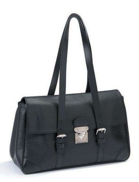 Sac à rabat en cuir épi noir, garniture en métal argenté, double anses. Poche fendue à l'arrière.