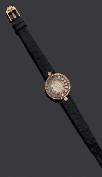 Modèle dame joaillerie «happy diamonds» en or 18K. Cadran champagne muet, aiguilles bâtons or. Mouvement quartz. 2 lunettes concentriques serties de diamants.