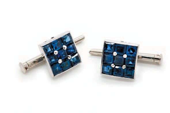 PAIRE DE BOUTONS DE PLASTRON en or gris 18K (750) sertis de saphirs calibrés