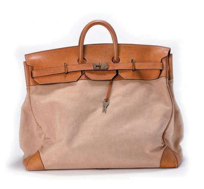 Grand cabas de voyage en toile écru et cuir naturel marron, garniture en métal doré.
