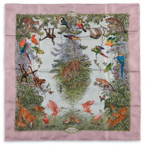 Foulard de soie imprimé à décors d'animaux sauvages d'Equateur.