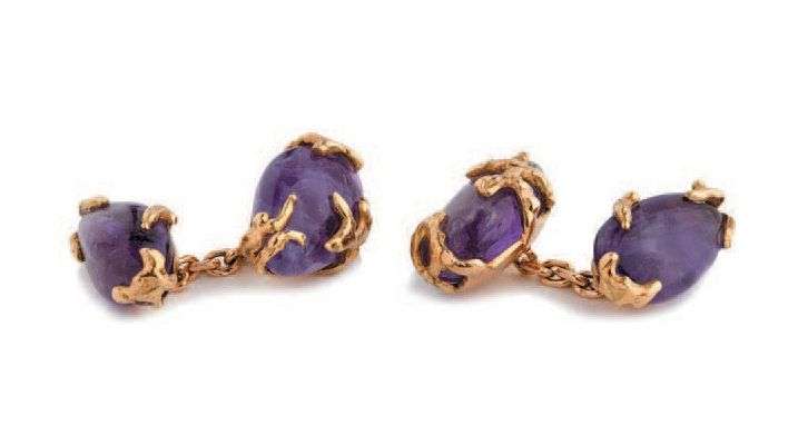 Paire de boutons de manchette en or jaune 18k (750) composés de cabochons d'améthystes.