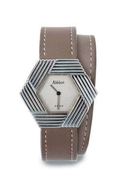 Montre de dame en acier de forme hexagonale. Cadran gris anthracite.