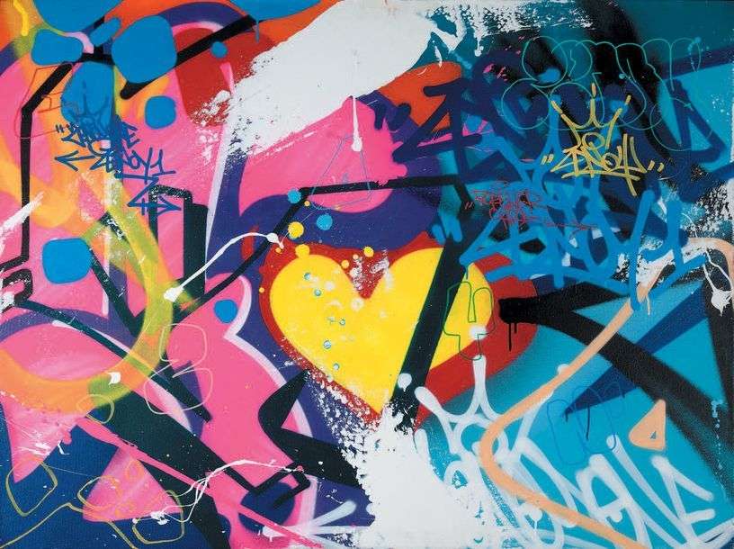 Huile et bombe aérosol sur toile, signée en haut à droite et en haut à gauche, contresignée et datée au dos