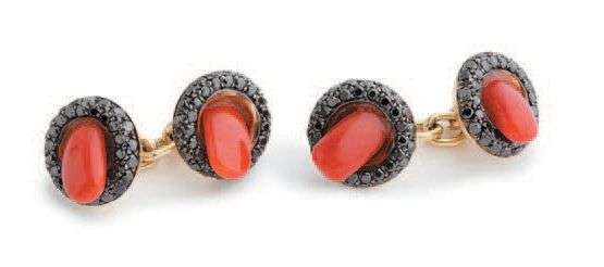 PAIRE DE BOUTONS DE MANCHETTE en or jaune 18k (750) composés d'un motif rond serti de diamants noirs et d'un corail.