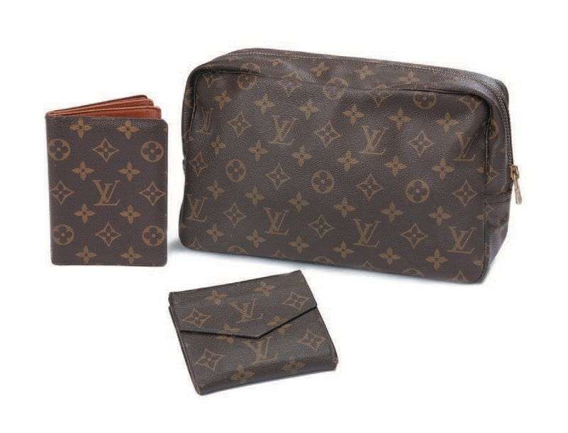 Ensemble composé d'un porte-monnaie, d'un porte-feuilles et d'une trousse de toilette monogrammée. Quelques usures.