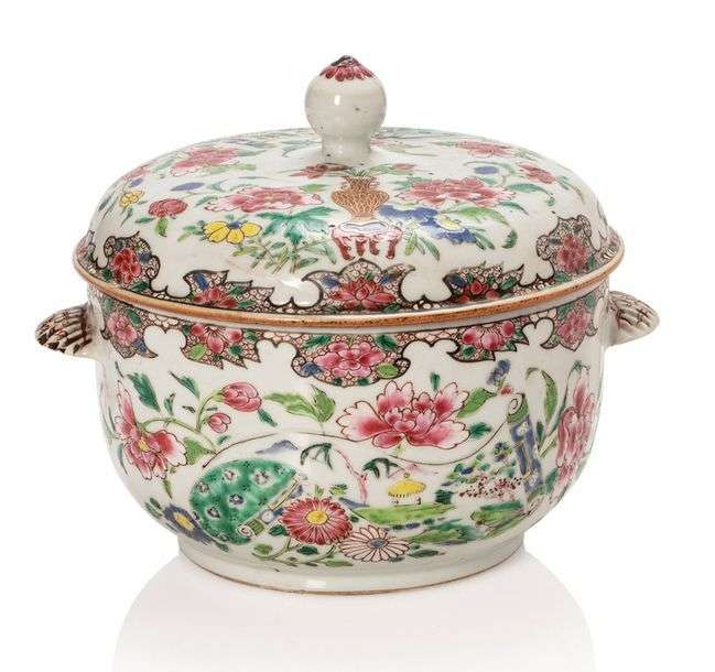 Bouillon couvert de forme circulaire en porcelaine et émaux de la famille rose à décor de paysages dans des réserves en forme de rouleaux déployés, parmi des rinceaux de pivoines et vases fleuris, une frise de motifs festonnés soulignant les bords.