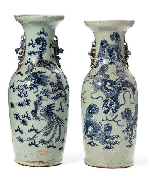 Deux vases balustres en porcelaine, à décor en bleu sur fond céladon, l'un orné en léger relief d'un dragon et d'un phénix parmi des nuages stylisés, l'autre à décor de lions bouddhiques, les cols rehaussés de félins en relief formant les anses. (Fêle étoilé sur la base de l'un et petit fêle sur la base de l'autre 一个炸底 一个底部有轻微裂纹).