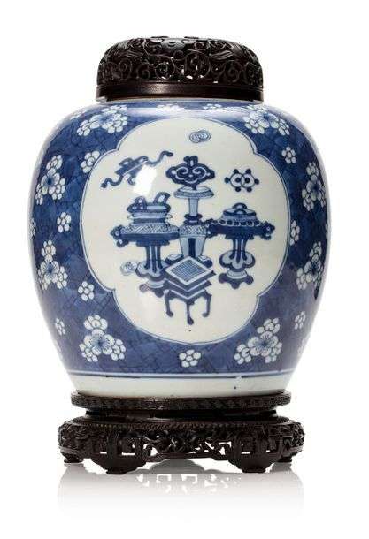 Pot à gingembre en porcelaine bleu-blanc orné sur la panse de trois médaillons à décor d'objets mobiliers et motifs auspicieux.