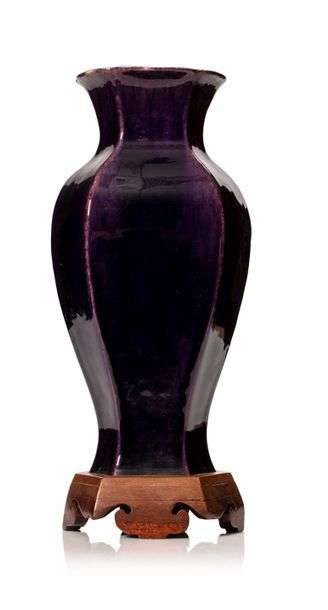 Vase en porcelaine monochrome aubergine. (Fond percé, sur socle en bois 底部打洞).