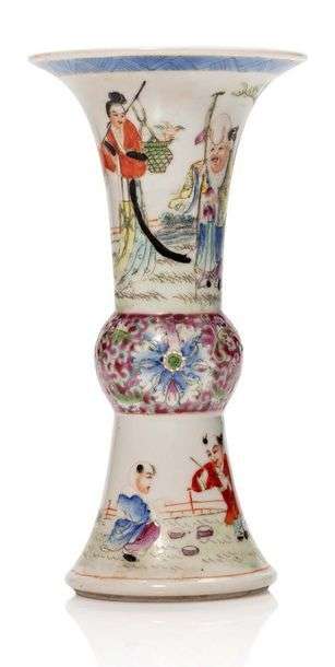 Petit vase de forme gu, en porcelaine et émaux de style famille rose à décor d'Immortels et enfants. Marque apocryphe Qianlong.