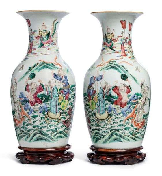 Paire de vases en porcelaine à décor des huit immortels traversant le fleuve. (Fêle sur le col d'un des vases, usures des émaux 瓶颈有裂)