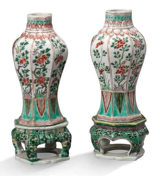 Paire de vases balustres à pans coupés en porcelaine et émaux de la famille verte, le décor central composé de huit branchages fleuris, la partie inférieure ornée de feuilles de bananiers stylisés, le col à motifs de feuilles de lotus en léger relief. Le support à l'imitation du bambou émaillé en sancai, à décor de fleurs.