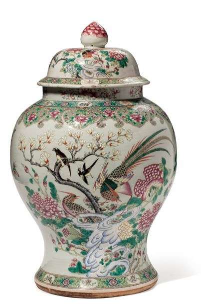 Potiche couverte en porcelaine et émaux de la famille rose, à décor de couples de pies et faisans sur des arbustes en fleurs parmi rochers et pivoines, le col souligné d'une frise de têtes de ruyi. (Fêle en haut de la panse 肚部有裂)