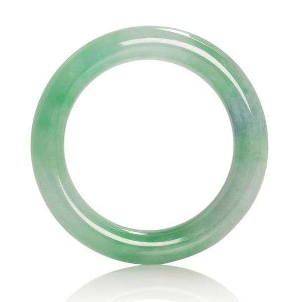 Bracelet jonc en jadéite veiné de vert clair et blanc, avec légère taches de mauve.
