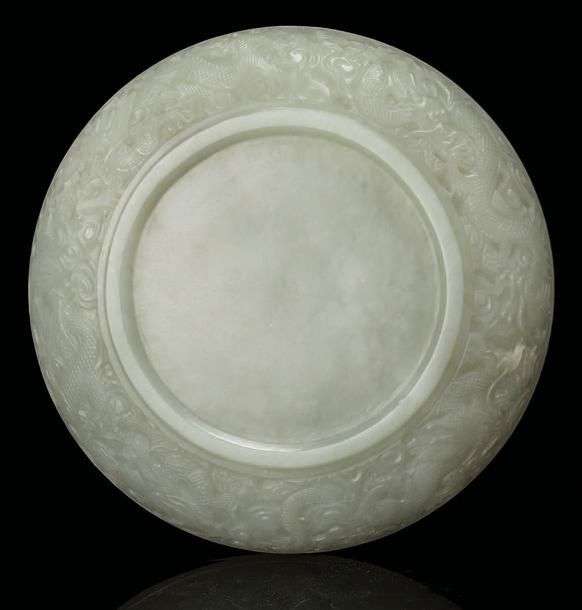 Petite coupe à fond plat en jade céladon, ornée au revers de dragons en relief passant parmi des nuages. (Petite égrenure 小磨损)