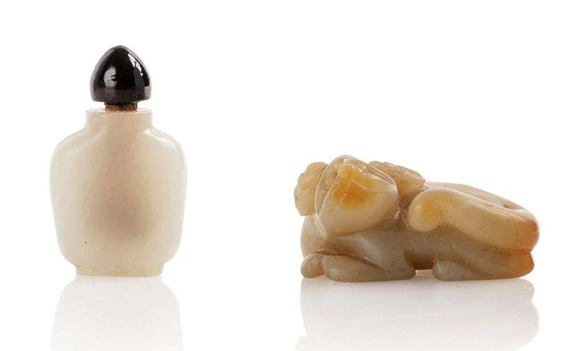 清朝 白玉籽料雕犬一件 白玉鼻烟壶一件