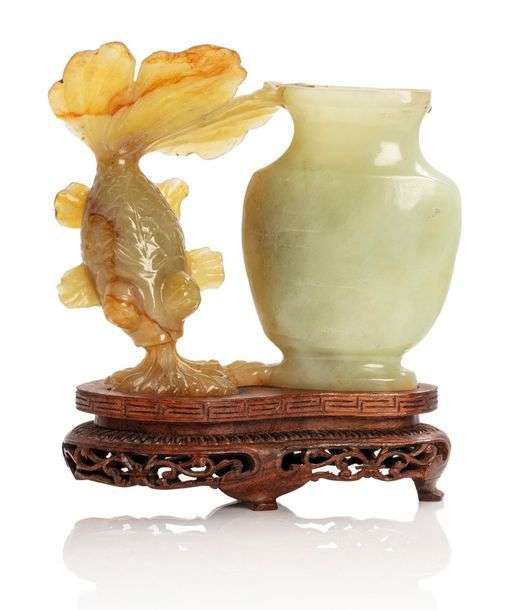 Groupe en jade formé d'un vase céladon accolé à un poisson-voile céladon veiné de brun.