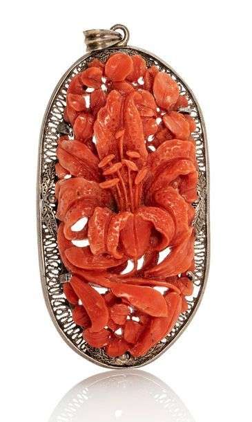 Pendentif en corail sculpté de lys, sur monture argentée ajourée.