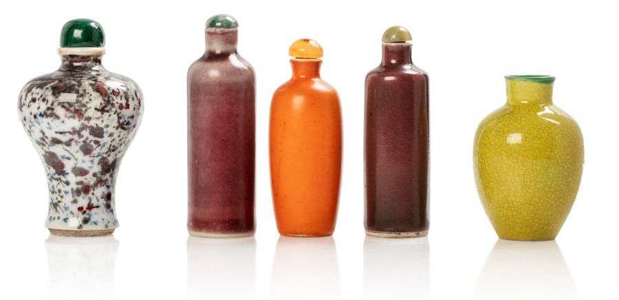 Lot comprenant cinq flacons tabatières en porcelaine, dont deux cylindriques et émail sang de boeuf, une de forme meiping à décor parsemé de bleu et rouge de cuivre sur fond blanc, une de forme balustre à émail jaune craquelé, et une cylindrique à émail corail.