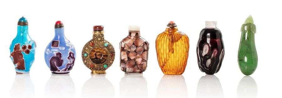 Lot comprenant sept flacons tabatières dont un en verre translucide à imitation de l'ambre, trois en verre overlay, l'une reprenant la forme d'une aubergine| un flacon en nacre, et une à décor filigranné et cabochon en oeil de tigre.