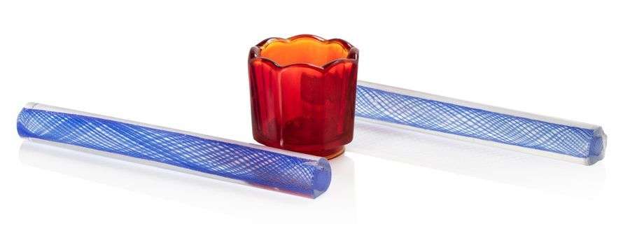 On y joint deux poids de calligraphes en verre de Pékin à l'imitation du verre vénitien. L. 17 cm