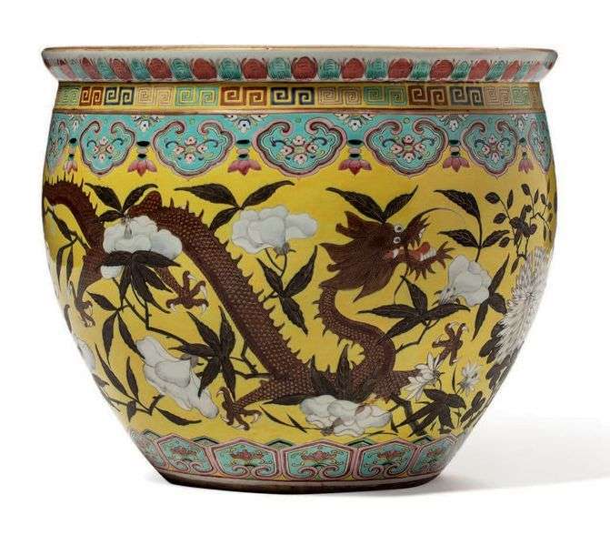 Vasque à poissons en porcelaine, les parois à décor sur fond jaune de dragons émaillés brun évoluant parmi des fleurs en camaïeu de blanc et brun, soulignées en partie haute et basse par des frises de têtes de ruyi et pétales de lotus stylisés en émaux de la famille rose, l'intérieur à décor corail et vert de poissons-voiles parmi des plantes aquatiques.