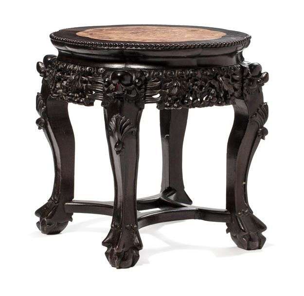 Tabouret à plateau polylobé avec plaque en marbre rose, la ceinture sculptée de coloquintes et feuillages, les quatre pieds réunis par des entretoises rayonnantes et crachés par des têtes fantastiques.