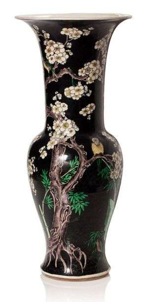 Vase yen-yen en porcelaine et émaux de style famille verte sur fond noir, à décor d’oiseaux perchés sur un prunus en fleurs, des bambous