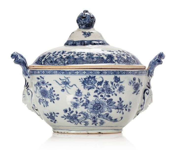 Terrine couverte en porcelaine émaillée bleu et blanc à décor de fleurs.