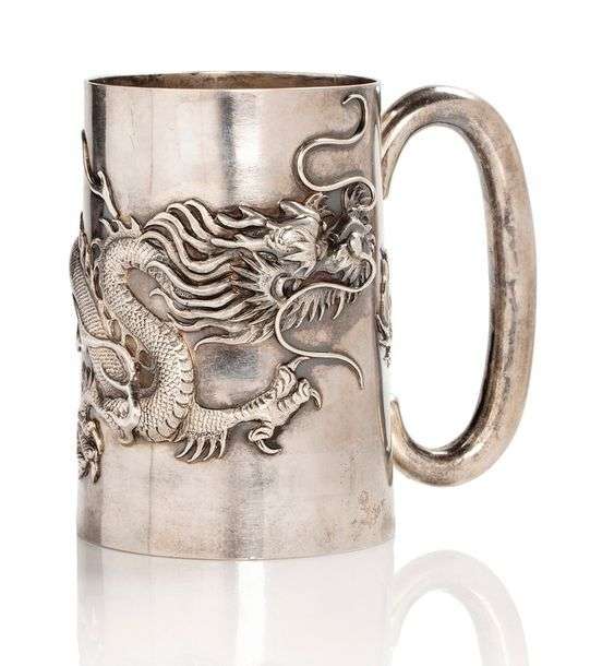 Chope en argent ornée d'un dragon en haut relief s'enroulant sur son pourtour. Poinçon sur la base, dont WH, Wang Hing et «90». Wang Hing & Co. était une célèbre maison qui créa un grand nombre de pièces d'argenterie pour l'exportation, à Hong Kong, Shanghai et Canton, entre le milieu du XIXe siècle et le milieu du XXe siècle.