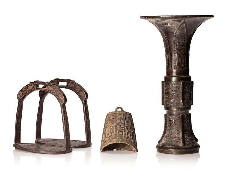 Lot d'objets en bronze comprenant un vase gu à décor de moifs archaisants, une paire d'étriers en fer incrusté d'argent, une cloche en bronze à décor de motifs archaisants.