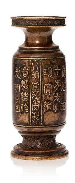 Petit vase en bronze de patine claire, à parois cylindriques, avec pied et col évasés, à décor en relief d'un poème sur les trésors, en caractères sigillaires. Marque apocryphe Qianlong sur la base.