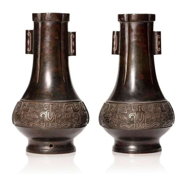 Paire de vases Hu à long col en bronze, à décor archaïsant en léger relief et ciselé de dragons et masques de taotie, deux anses tubulaires complétant le décor.