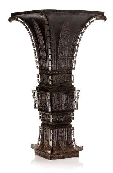 Grand vase gu en bronze de patine brune orné de motifs archaisants représentant cigales stylisées et masques de taoties.