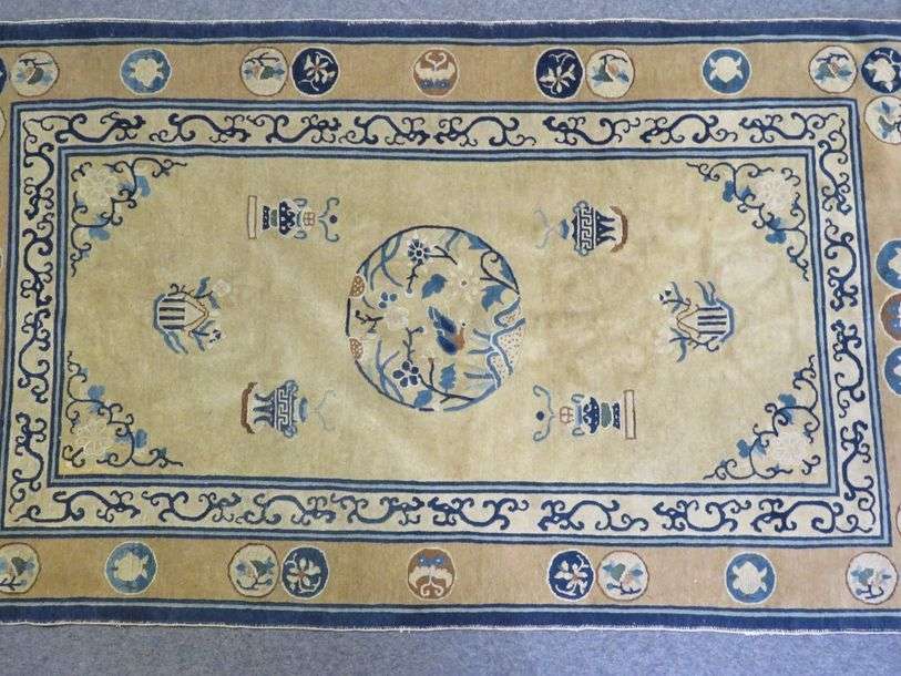 Tapis rectangulaire en laine à décor en camaïeu de bleu et rehauts vert et brun sur fond beige, centré d'un médaillon floral entouré d'objets mobiliers, le pourtour souligné de rinceaux et médaillons.