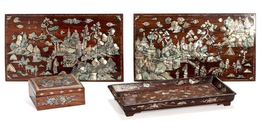 Ensemble en bois de rose incrusté de nacre comprenant une boîte (13 x 13 x 5 cm) et deux panneaux (34,5 x 19,5 cm) à décor de personnages.On y joint un plateau en bois à décor floral incrusté en nacre (craquelure).