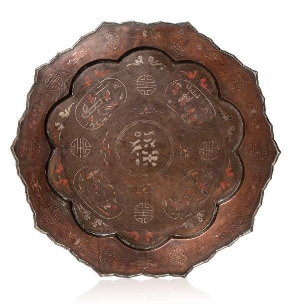Grand plateau floriforme en cuivre à décor niellé d'argent et motifs shou.