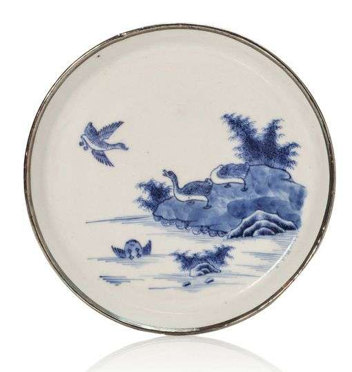 Deux coupelles en porcelaine bleu blanc cerclées de métal argenté à décor d'envol de canards et d'un pêcheur dans une embarcation.