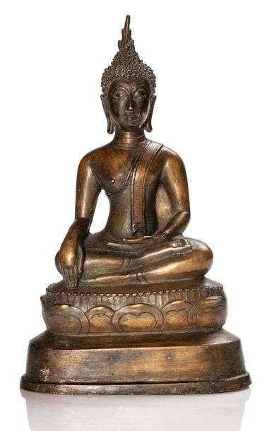 Sujet en bronze représentant le Bouddha assis en méditation sur un socle lotiforme.