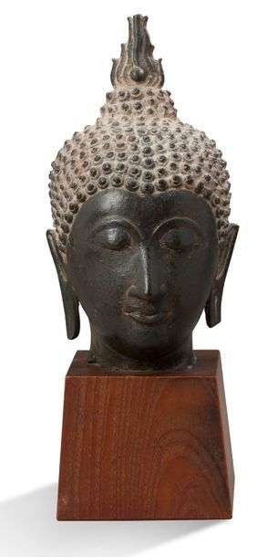 Tête de bouddha en bronze, les yeux mi-clos et esquissant un léger sourire, la coiffe surmontée de la flamme.