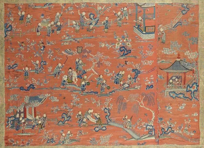 Grande tenture en soie corail brodée aux fils polychromes, à décor des cent enfants, ceux-ci figurés dans des pavillons, sur un pont, sur des terrasses, cueillant des pêches, grimpant dans des arbres. (Usures, petits accidents| insolée| encadrée sous verre 小磨损,伤彩)
