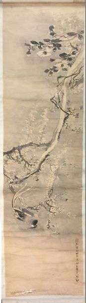 Grande peinture sur papier, représentant un faisan reposant sur la branche d'un arbre, des fleurs de pivoine au pied de l'arbre. Porte une signature apocryphe de Li Gu (l'époque Qing).Pliures. 折页