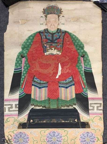 Grand portrait d'ancêtre, couleurs sur papier, représentant une dame de cour, vêtue dans sa robe rouge de cérémonie à décor de dragons, elle porte une coiffure importante à décor de phénix, assise sur un fauteuil noir reposant sur un tapis richement décoré de fleurs de lotus. (Pliures, déchirures et restauration).