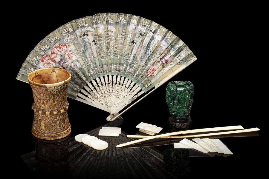 Lot de plusieurs objets, comprenant un vase en ivoire patiné, à paroi cintrée au milieu, orné en relief d’un dragon et d’un phénix | deux maîtres-brins d’éventail en ivoire | une tabatière en malachite sculptée de fleurs et feuillages | quatorze jetons en nacre à décor floral incisé. (Restauration au vase | manque le bouchon de la tabatière 笔筒有修,鼻烟壶缺盖). Haut. 11 cm - 6 cm.