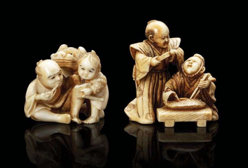 Deux petits netsuke okimono en ivoire légèrement teinté, l'un représentant un père et son fils, ce dernier tenant un masque de shishimai, signé Jugyoku avec kakihan| le second figurant deux personnages, l'un préparant un poisson, signé sur la base