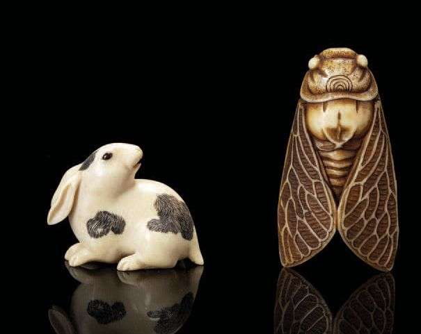 Lot comprenant un netsuke en ivoire teinté, représentant une cigale tenant une feuille entre ses pattes| et un petit lapin en ivoire taché de brun, son côté droit ouvert, révélant des personnages dans une forêt, signé.