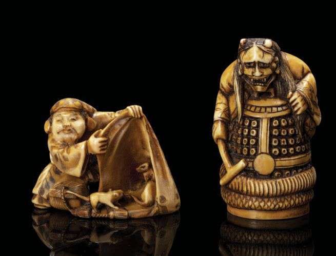 Deux petits netsuke en ivoire teinté, l'un représentant la sorcière Kiyohime entourant la cloche du Dôjôji sous laquelle est réfugié Anchin, ce dernier mobile| l'autre figurant Daikoku faisant entrer des rats dans un sac. Signés respectivement Chikamitsu et Hôgyoku.